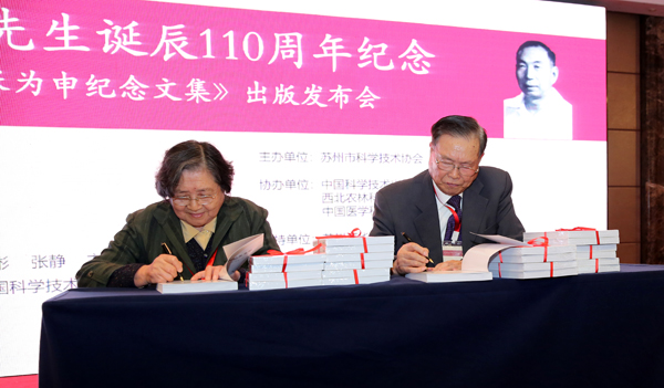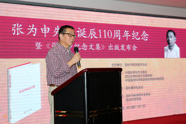 會(huì)議由蘇州科技史學(xué)會(huì)理事長(zhǎng)、研究員王晨主持,蘇州市科協(xié)黨組書(shū)記、主席程波致辭。她高度贊揚(yáng)了張為申先生自主創(chuàng)新、科學(xué)為民、愛(ài)國(guó)奉獻(xiàn)的精神。清華化學(xué)系原黨委副書(shū)記李兆隴教授、西北農(nóng)林科技大學(xué)宣傳部閆祖書(shū)部長(zhǎng)、中國(guó)醫(yī)學(xué)科學(xué)院藥物研究院蔣建東院長(zhǎng)分別致辭,以崇敬之心緬懷張為申先生為我國(guó)抗生素研究事業(yè)所作出的杰出貢獻(xiàn)?!稄垶樯昙o(jì)念文集》在諸多權(quán)威專(zhuān)家、領(lǐng)導(dǎo)和與會(huì)人員的見(jiàn)證下,由蘇州市科協(xié)主席程波和文集主編胥彬、張靜共同宣布首發(fā)。