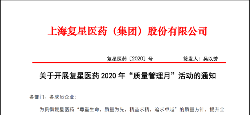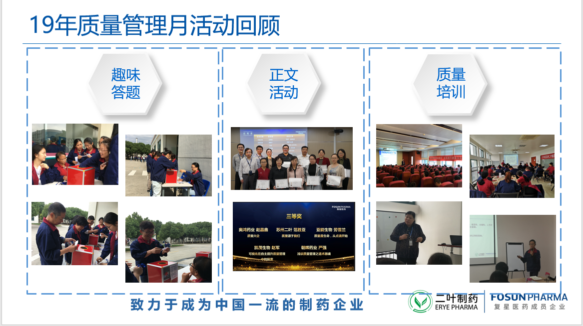 來源: 發(fā)布時(shí)間:2020-09-15 11:31:00 為貫徹復(fù)星醫(yī)藥“尊重生命,質(zhì)量為先,精益求精,追求卓越”的質(zhì)量方針,提升全員質(zhì)量意識(shí)及質(zhì)量能力,踐行復(fù)星醫(yī)藥“質(zhì)量為先”的質(zhì)量文化,根據(jù)復(fù)星醫(yī)藥〔2020〕號(hào)《關(guān)于開展復(fù)星醫(yī)藥 2020 年“質(zhì)量管理月”活動(dòng)的通知》文件精神,二葉制藥將于2020年9月至10月開展為期兩個(gè)月的質(zhì)量管理月活動(dòng)。